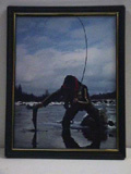 FISHING - "MAN PULLING FISH OUT OF WATER", colour photo, black & gold metal frame |