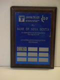 "BANK OF NOVA SCOTIA, LEARNING FOR LIFE", blue metal on brown wood |